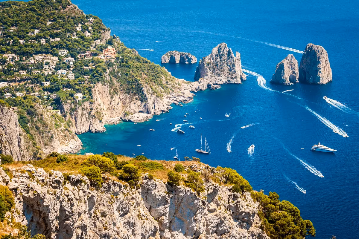 La isla de Capri, en el golfo de Nápoles, recibe cada año a numerosos turistas que vienen a relajarse, descubrir sus numerosos monumentos y disfrutar de la naturaleza. Pintorescos jardines, impresionantes formaciones rocosas y la famosa gruta azul son sólo algunos de los atractivos paisajísticos de la isla. También hay una villa imperial del siglo I y otros yacimientos arqueológicos y, por supuesto, las delicias culinarias de Italia.