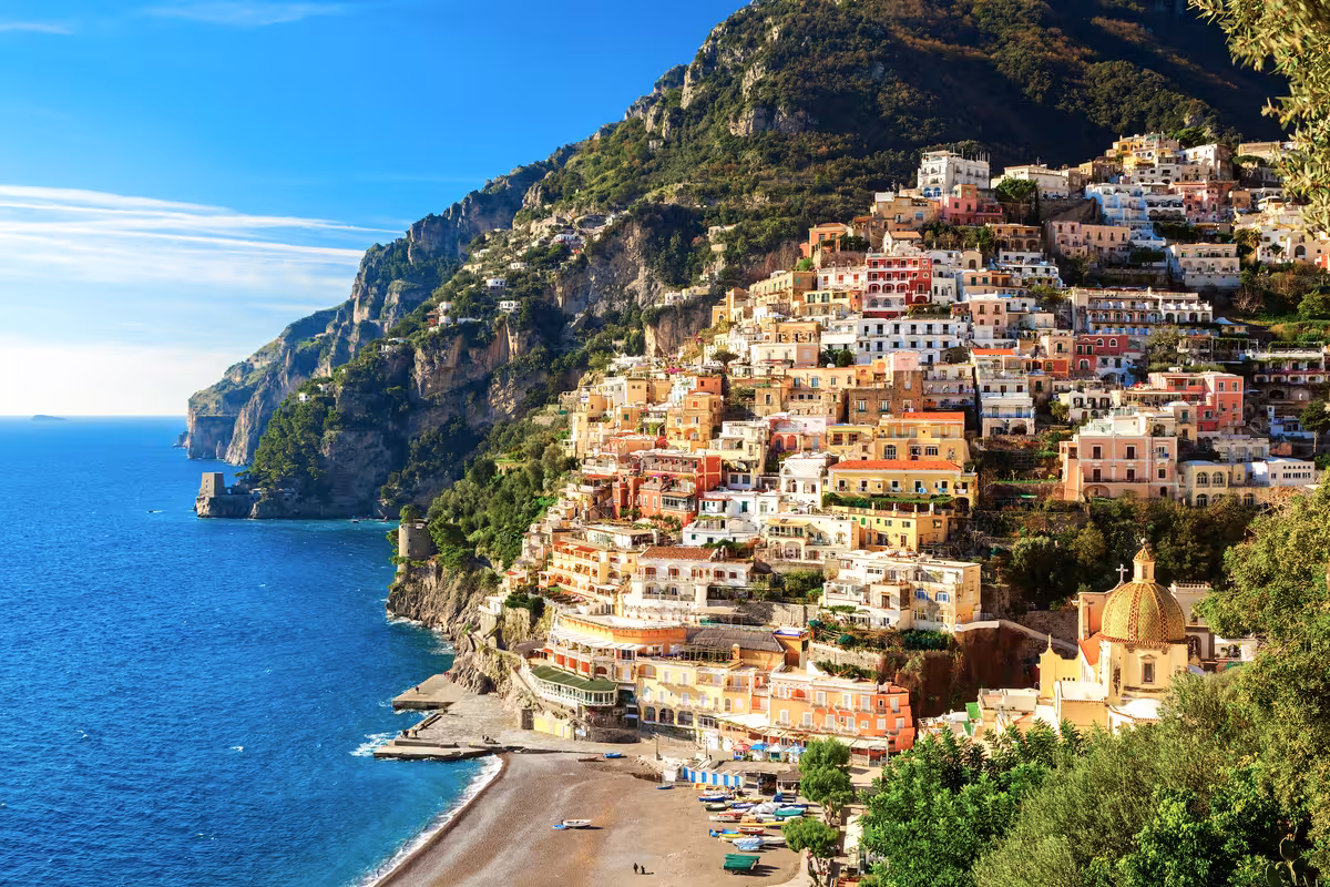 se remonta a tiempos remotos. Antaño próspera ciudad comercial del Imperio Romano, floreció en los siglos XVI y XVII gracias al comercio marítimo. Hoy en día, las huellas de este agitado pasado son visibles tanto en la arquitectura como en las tradiciones culturales. La influencia marítima es inconfundible. La ciudad se extiende a lo largo de la costa y ofrece impresionantes vistas de las aguas claras y azules del mar Tirreno. Positano también es conocida por sus desafiantes subidas y escaleras que recorren toda la ciudad, creando un impresionante laberinto de callejuelas, rincones ocultos e impresionantes miradores. La economía local se beneficia enormemente del turismo. Además de hoteles y apartamentos de vacaciones, hay numerosas boutiques que venden las sandalias hechas a mano, la cerámica y los vestidos de lino típicos de Positano. La ciudad también es conocida por su oferta culinaria, que abarca desde marisco fresco hasta platos tradicionales italianos y vinos de la región. A pesar de la gran afluencia turística, Positano ha conservado su encanto auténtico. Lejos de las multitudes de turistas, aún se pueden encontrar rincones tranquilos donde disfrutar de la cultura local a un ritmo relajado. La iglesia de Santa Maria Assunta, con su majestuosa cúpula, es un hito histórico y uno de los destinos favoritos de los amantes de la cultura. Positano es también un punto de partida ideal para realizar excursiones por la Costa Amalfitana. La ciudad ofrece excursiones en barco a las islas vecinas y a otras ciudades costeras, así como rutas de senderismo para los amantes de la naturaleza, en particular el famoso "Sentiero degli Dei" (Sendero de los Dioses), que ofrece unas vistas espectaculares de la costa.